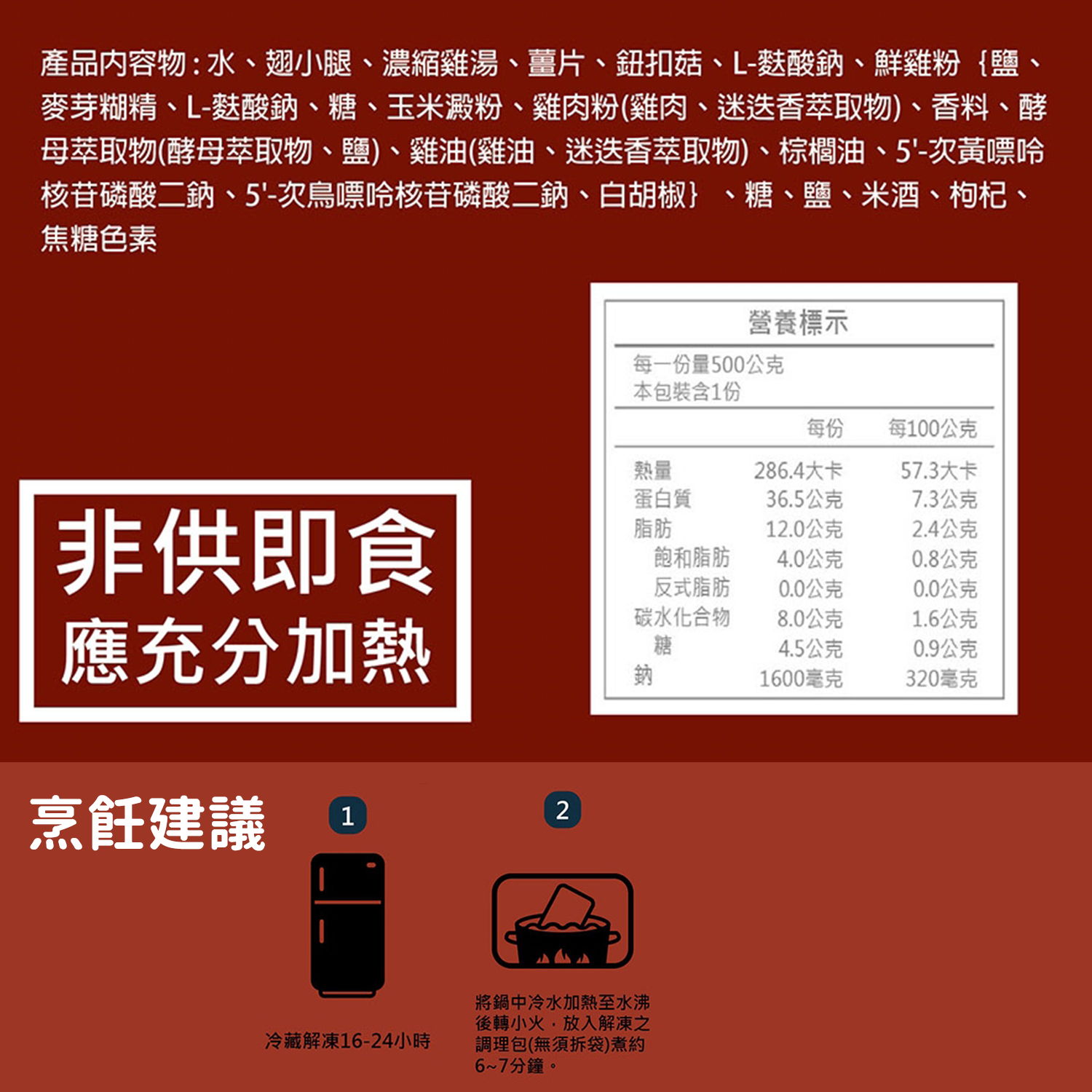 ●嚴選國產CAS雞肉,翅腿肉質鮮甜多汁,搭配厚實香菇,補充元氣